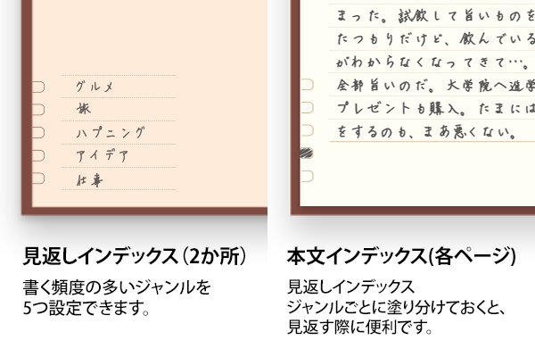扉ページに日記でよく書くジャンルを 5つ設定し、設定したジャンルと同じ内容のページのインデックスを塗りつぶすことで、 後からかんたんにジャンル別で見返すことができます。