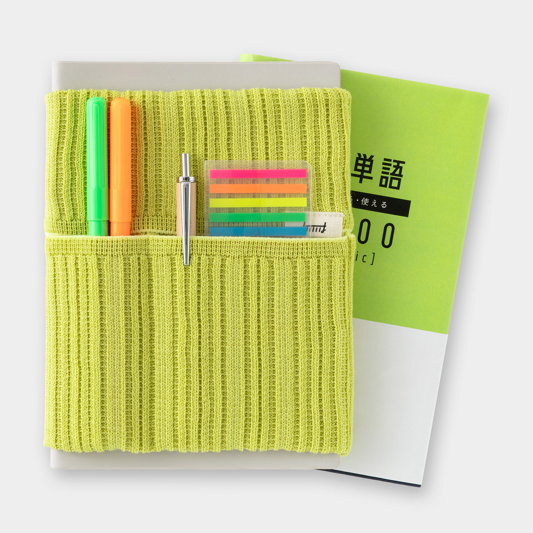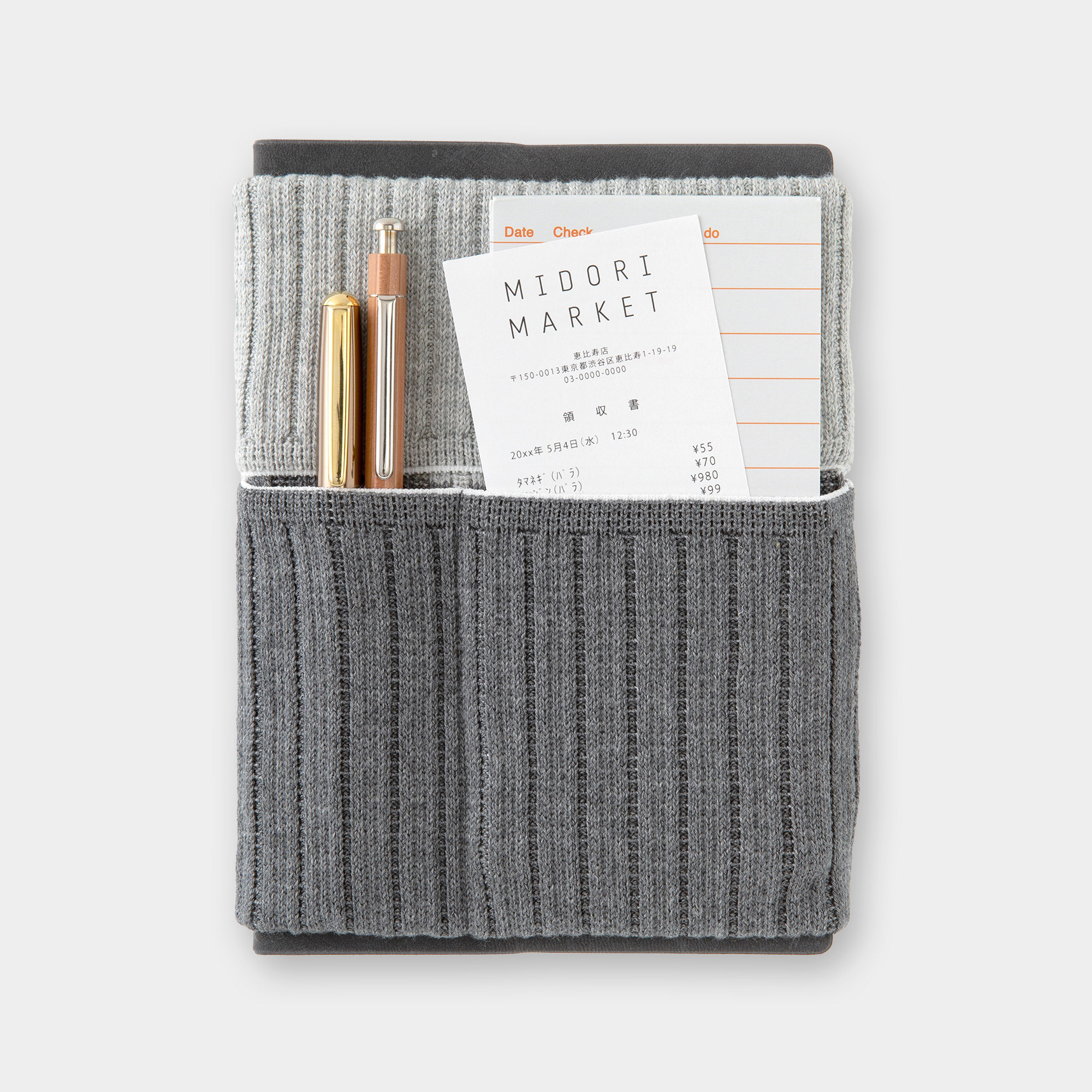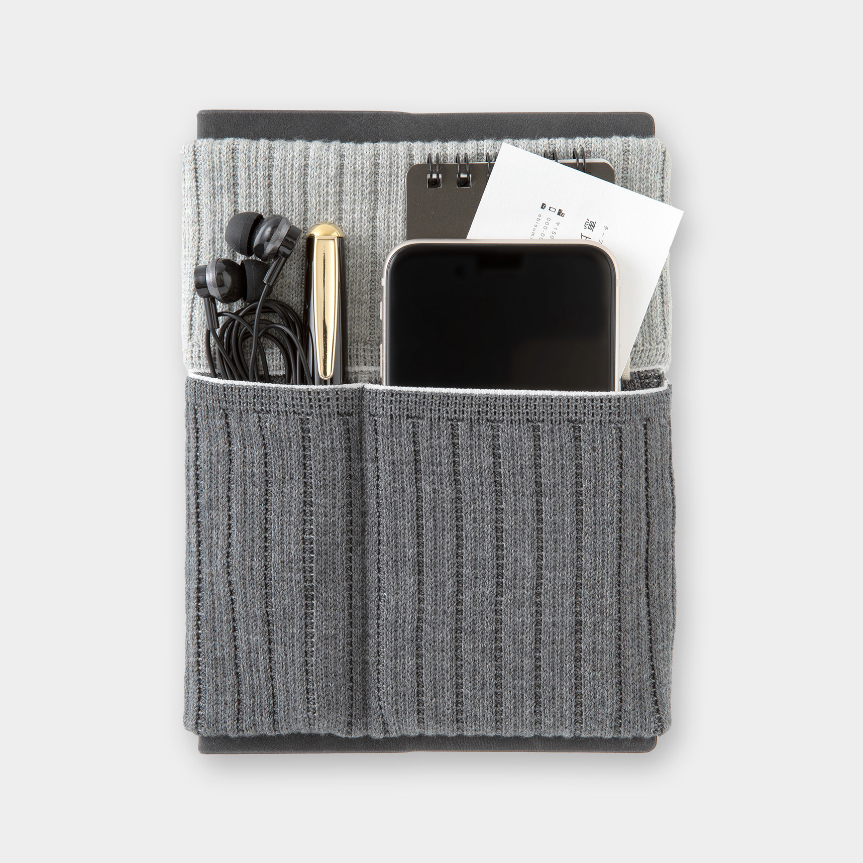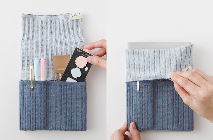 伸縮性のあるポケットにペンや小物を収納して、手帳と一緒に持ち運べます。また、カバンの中で手帳が開いてしまうのを防ぐブックバンドとしての役目も果たします。生地はよく伸びて丈夫なニット素材。国産の高品質な「五泉ニット」を使用しています。