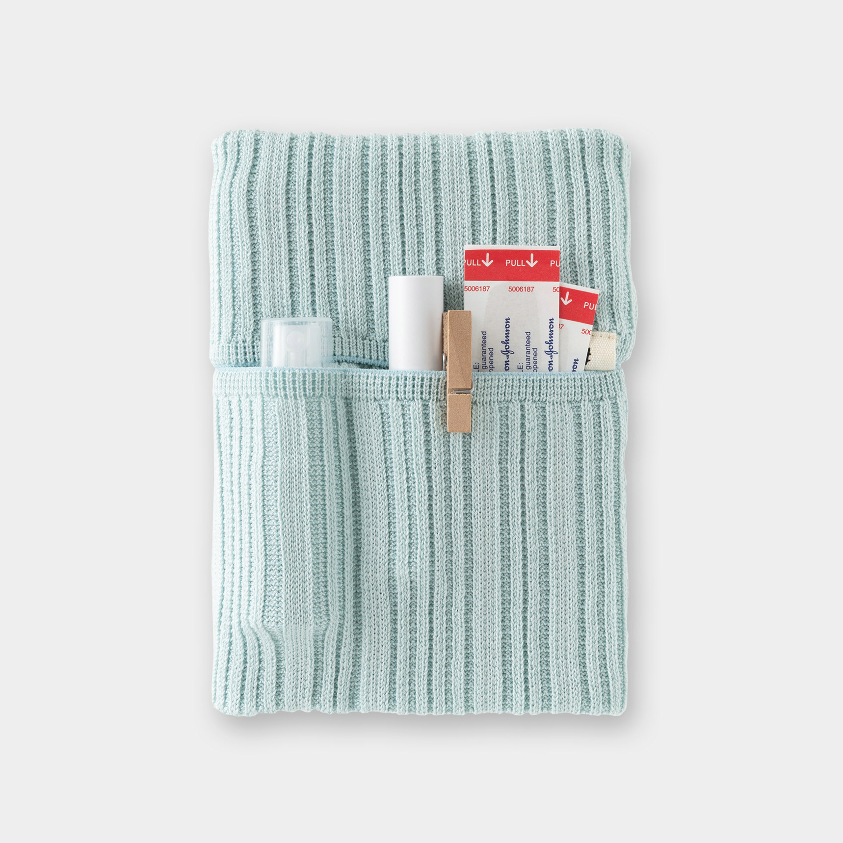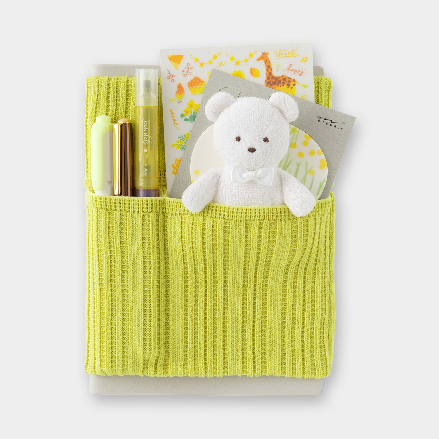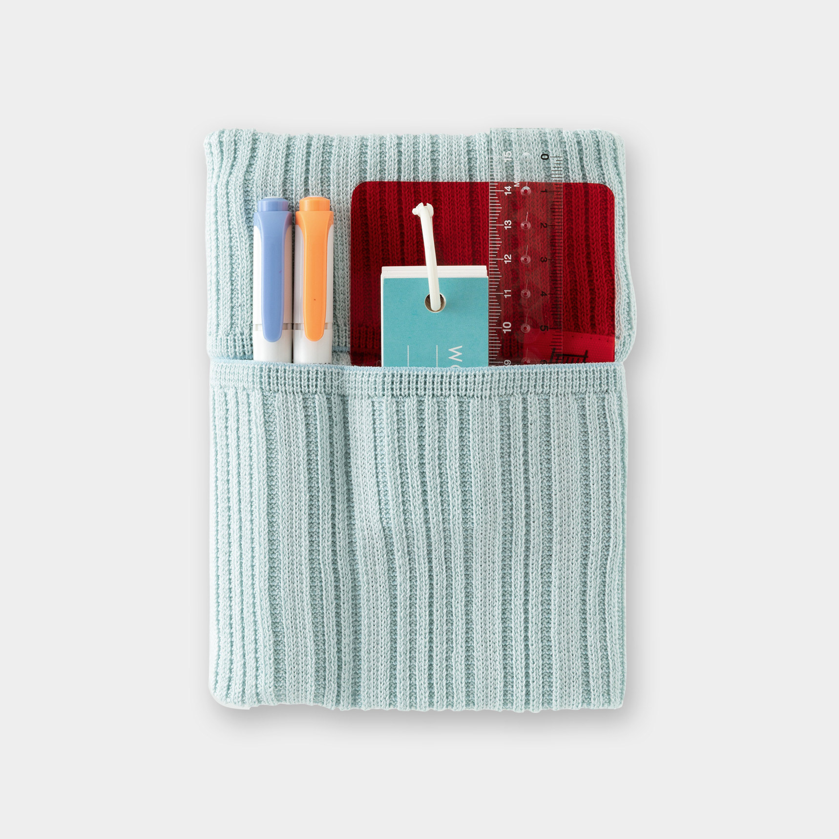伸縮性のあるポケットにペンや小物を収納して、手帳と一緒に持ち運べます。また、カバンの中で手帳が開いてしまうのを防ぐブックバンドとしての役目も果たします。生地はよく伸びて丈夫なニット素材。国産の高品質な「五泉ニット」を使用しています。
