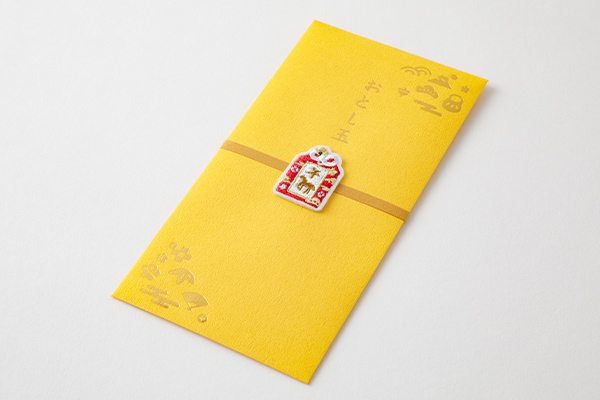 お正月にふさわしい華やかなデザインのおとし玉袋。「金封」はお札を折らずにそのまま入れられるサイズ。