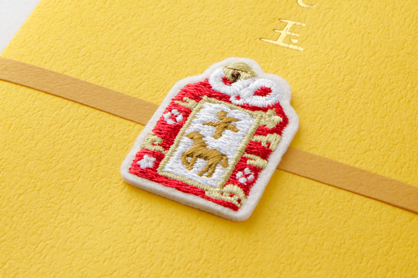 【お守り柄 午】お守りには「午」の文字と馬の刺繍が施されており、年齢や性別を問わず贈りやすいデザインです。