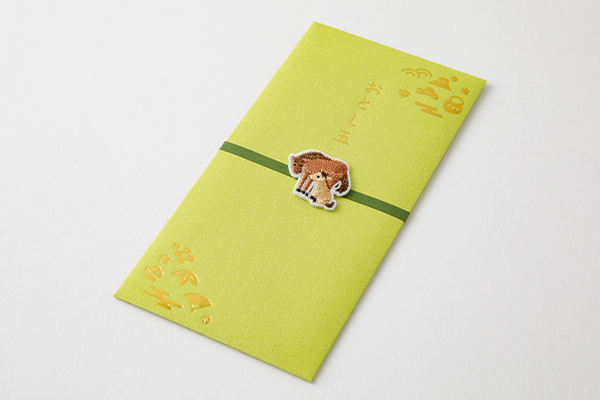 お正月にふさわしい華やかなデザインのおとし玉袋。「金封」はお札を折らずにそのまま入れられるサイズ。
