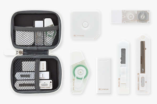 とっても小さい文房具「XS(エックスエス)」シリーズの、ハサミ・ホッチキス・修正テープ・テープのり・カッター・メジャーの6アイテム全部が専用ケースに入った『XSステーショナリーキット』。