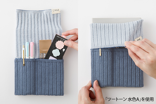 「手帳のはらまき」は、手帳に着せる収納ポーチです。生地はよく伸びて丈夫なニット素材。ブックバンドとして手帳にはめたり、ポケットにペンや小物を収納したり便利に使えます。