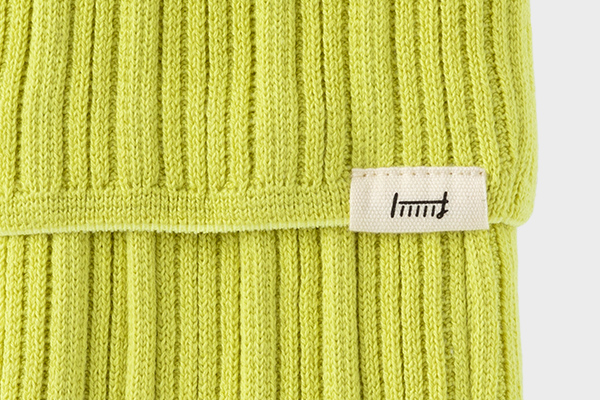 ライムイエローは爽やかな「ランダムリブ編み」。よく伸びて丈夫なニットは国産の高品質な「五泉ニット」を使用しています。