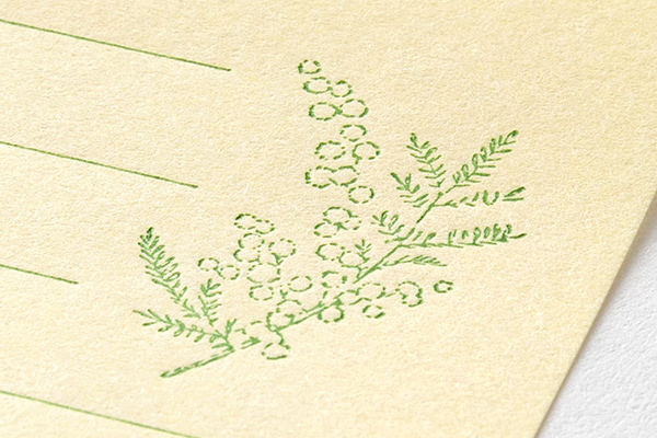 オリジナルで抄紙した先染めの越前和紙「花色和紙」を使用し、風に戯れて舞うような柔らかな「ミモザ」の黄色が和紙にうつされています。