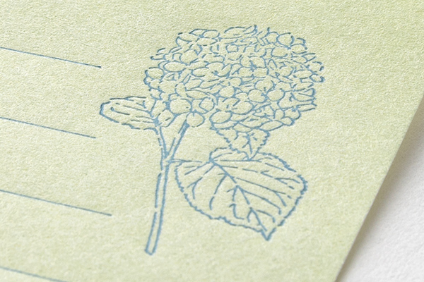 オリジナルで抄紙した先染めの越前和紙「花色和紙」を使用し、優しくふんわりと揺らめく「アナベル」の若葉色が和紙にうつされています。