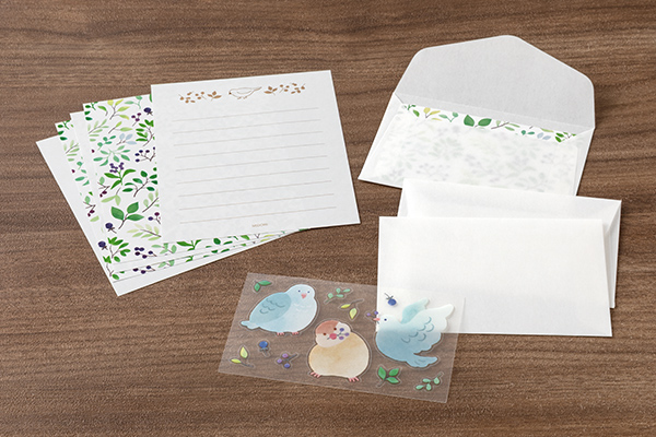 【トリ柄】グリーン系の葉っぱや木の実をあしらった、送る相手を選ばない落ち着いた雰囲気の便箋のデザインです。便箋の筆記面には、木の実を探すトリの姿が描かれています。