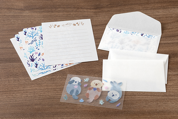 【ラッコ柄】ブルーを基調に、珊瑚や貝殻、海藻など海のモチーフをちりばめた爽やかな便箋のデザインです。便箋の筆記面には、気持ちよさそうに海に浮かぶラッコの姿が描かれています。