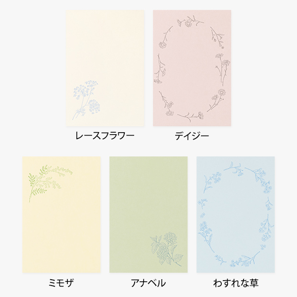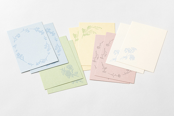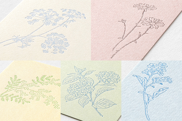はがきは書き心地にもこだわり、活版印刷で趣のある仕上がりとなっています。自社工場の職人が1枚1枚丁寧に印刷しており、繊細な花の絵柄が引き立ちます。