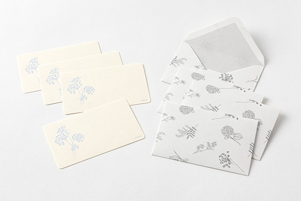 ミニカードは書き心地にもこだわり、活版印刷で趣のある仕上がりとなっています。自社工場の職人が1枚1枚丁寧に印刷しており、繊細な花の絵柄が引き立ちます。