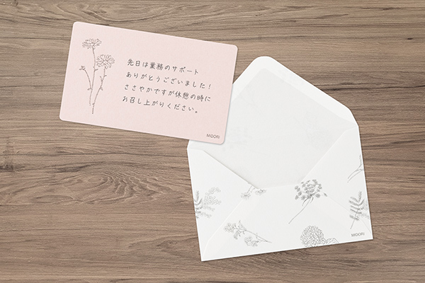 ミニカードは花が一輪添えられているようなデザインなので、一言書くだけで、すてきなメッセージギフトに。