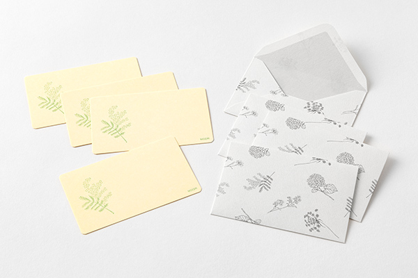 ミニカードは書き心地にもこだわり、活版印刷で趣のある仕上がりとなっています。自社工場の職人が1枚1枚丁寧に印刷しており、繊細な花の絵柄が引き立ちます。
