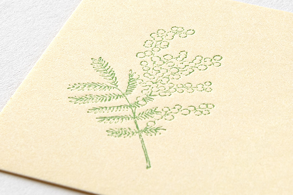 オリジナルで抄紙した先染めの越前和紙「花色和紙」特厚口を使用し、風に戯れて舞うような柔らかな「ミモザ」の黄色が和紙にうつされています。