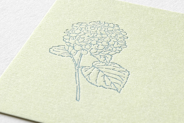 オリジナルで抄紙した先染めの越前和紙「花色和紙」特厚口を使用し、優しくふんわりと揺らめく「アナベル」の若葉色が和紙にうつされています。
