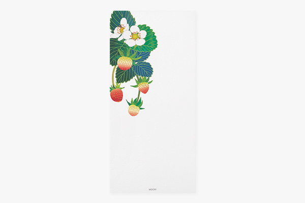 パールシルク箔を施した苺の白い花と、鮮やかな緑色の葉のコントラストが美しく表現されています。