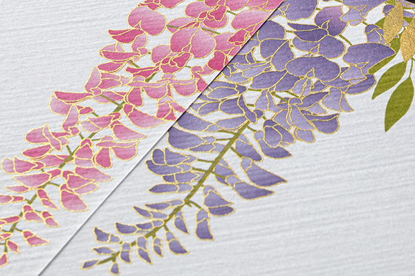 花びら部分に細く繊細に輝く金色のシルク印刷を施し、風に揺れる満開の藤の花を表現しました。