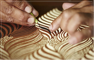 『伊勢型紙』について 「伊勢型紙」は着物の型染めに用いられてきた、三重県伊勢地方の伝統工芸品。熟練の職人が、柿渋の紙に紋様を丁寧に手彫りして作られます。