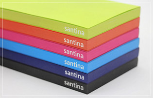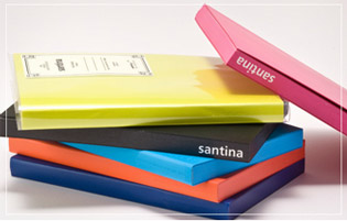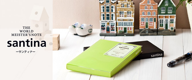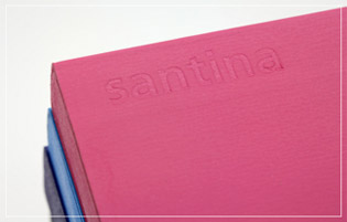 『サンティナ』名前の由来 表紙に使用している、オランダ製レザーペーパーそのものの名前です。ロゴはオランダのスキポール空港でサインに使われている「フルティガ」という書体を採用。