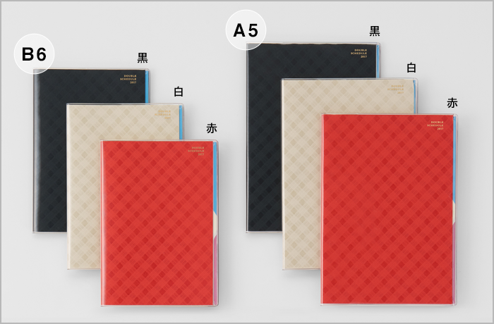 予定を書き込む量にあわせて選べる、「B6」「A5」の2サイズでカバーは黒、白、赤の3色を展開。