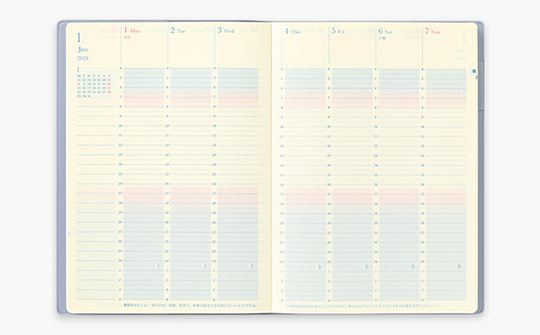最大の特徴は、日の出、日の入りの変化を淡いグラデーションで表現した24時間表記の週間バーチカル。日の長さを視覚的に実感することで、忙しい毎日でも丁寧な暮らしを大切にすることができます◎