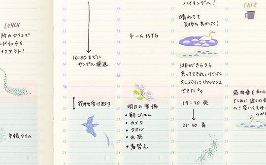 「フリーページ」には、タイムスケジュールの管理に加え、たっぷりと設けられた余白に日記やイラストを書いたりなど、自由に使うことができます。