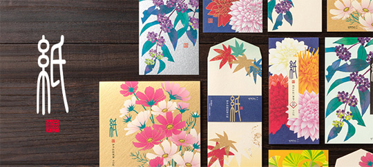 緑から深い赤へと彩をかさねるもみじを、上品な金シルク印刷と表裏印刷で表現しました。