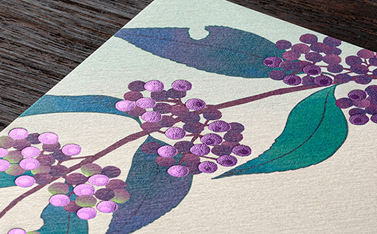 美しく色づいた紫式部の葉と実。紫のメタリック箔を使用し、実の一粒一粒を繊細な輝きで表現しました。