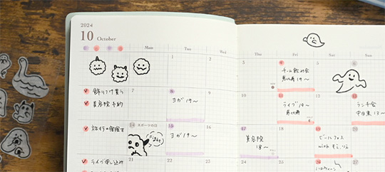 月間ブロックにシールを貼るだけでも楽しげですし、プラスで『ジョインドッツ』を使って色味を加えることで、よりハロウィーンらしさが演出できます。