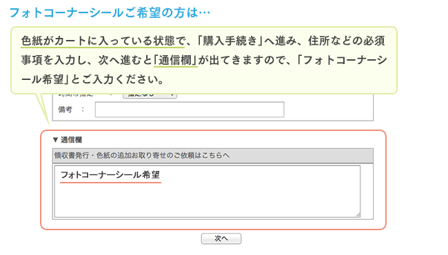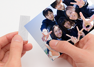 台紙を持ったまま、シールのコーナー部分に写真を挟みシールを外します。この要領で、写真の4つ角にシールを取り付けます。