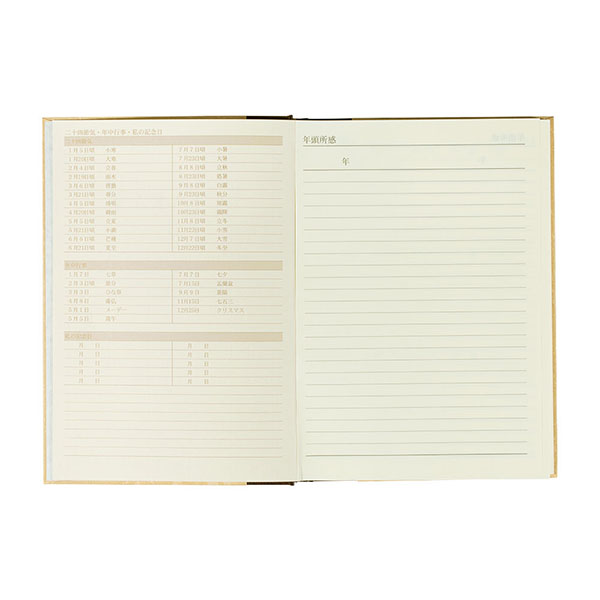 年頭所感のページ。この他にも年末所感のページ、メモページ、住所録、贈答控え、慶弔事控え、おぼえ書きなど充実の付録。