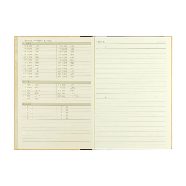一年の始まりに書く、年頭所感のページ。この他にも年末所感のページ、住所録、贈答控え、おぼえがきなど充実の付録。