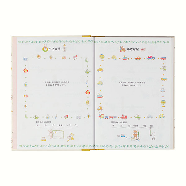 生まれたばかりの小さな手形、足形をとって貼付けるページは、良い記念になります。