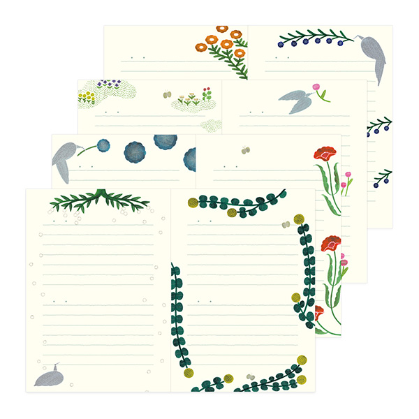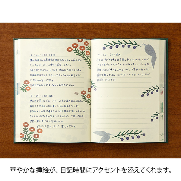 本文は8ページ分(4柄)の異なるデザインが繰り返される構成でイラストを楽しみながら日記を綴ることが出来ます。