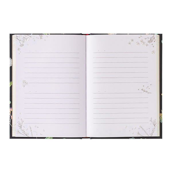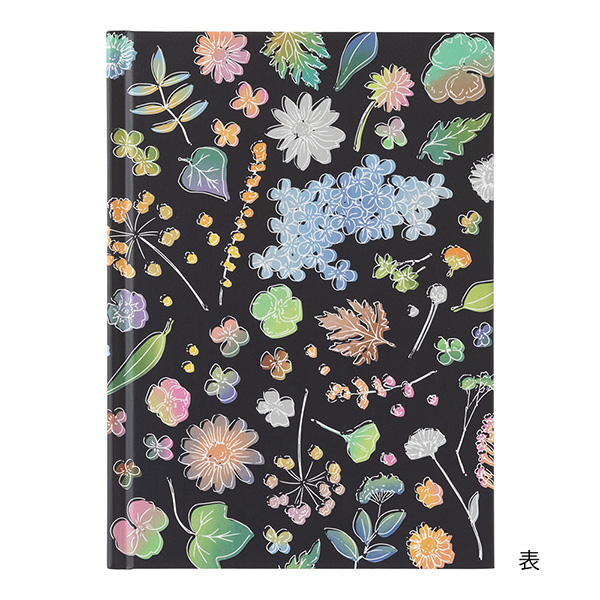 静かな夜をイメージした背景の深い紺色には押花が神々しく光っており、花々に囲まれ、おだやかな気持ちで記録を楽しむことができます。