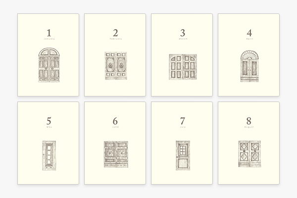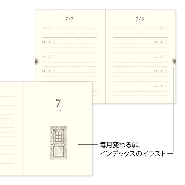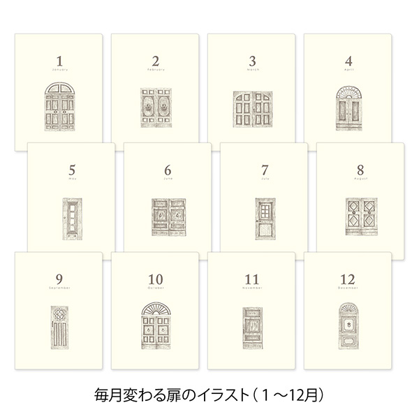 月が始まるページには、毎月異なる扉のイラストが描かれています。扉を開けるように新しい月のページをめくりながら、日々を綴ってみましょう。