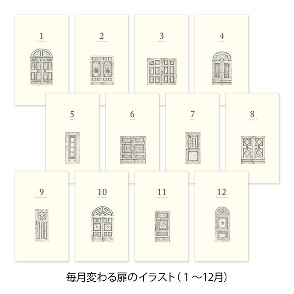扉を開けるように、新しい月のページが始まります。毎月異なる扉のイラストです。