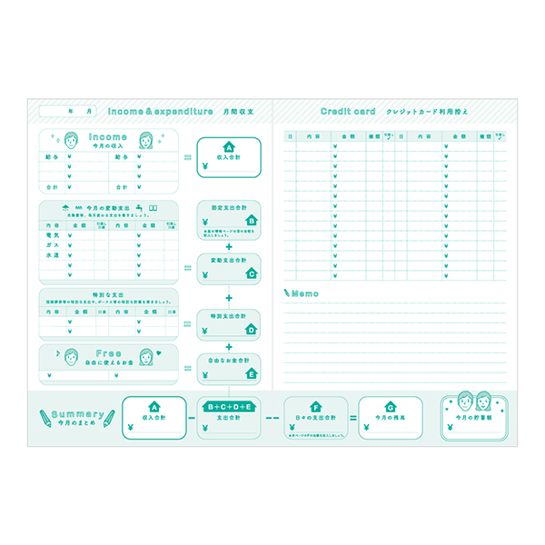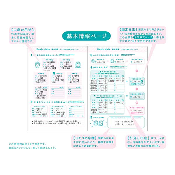 複数ある口座やクレジットカードの情報をまとめて記載できる欄や、月間収支ページには2つの収入欄があるなど、共働きのお金の流れをつかむのにピッタリな内容。