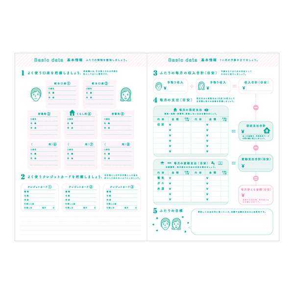 ふたりの情報を記入して、お金の準備を計画的にしましょう。口座やカードの情報がまとまって分かりやすい!