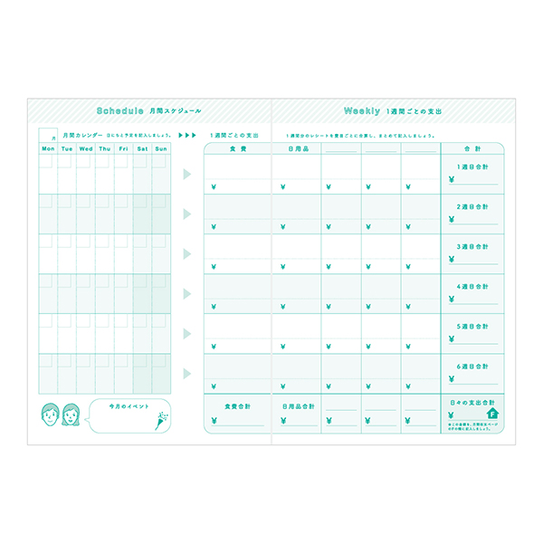 | 内容 | 60ページ(12ヶ月分) 使用説明、基本情報、月間収支、1週間ごとの支出、年間収支表、、メモ |