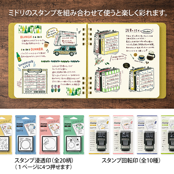 スタンプのインキが裏抜けしにくい厚手の紙を本文に使用したノートです。 表紙が2つ折り構造になっており、折り曲げた部分をページの間に挟むと、隣のページへのインキ移りを防いでくれたり、しおりとしても使用できます。
