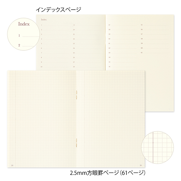 | 内容 | 本文/MD用紙 61ページ(2.5mm方眼罫) 付録/KEYページ、インデックスページ ステッチャー製本 |