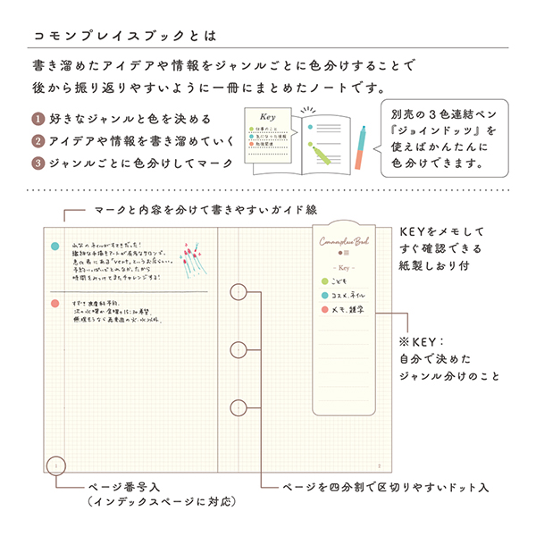 専用ノートには、各ページの端にガイド線があり、ジャンルごとに色分けがしやすくなっていたりと、コモンプレイスブック作りをサポートしてくれる工夫がたくさん盛り込まれています◎