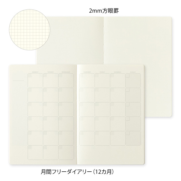 | 内容 | 本文/「MD用紙」厚口 月間スケジュール(12ヶ月)、2mm方眼罫メモ…計48ページ 糸かがり綴じ |