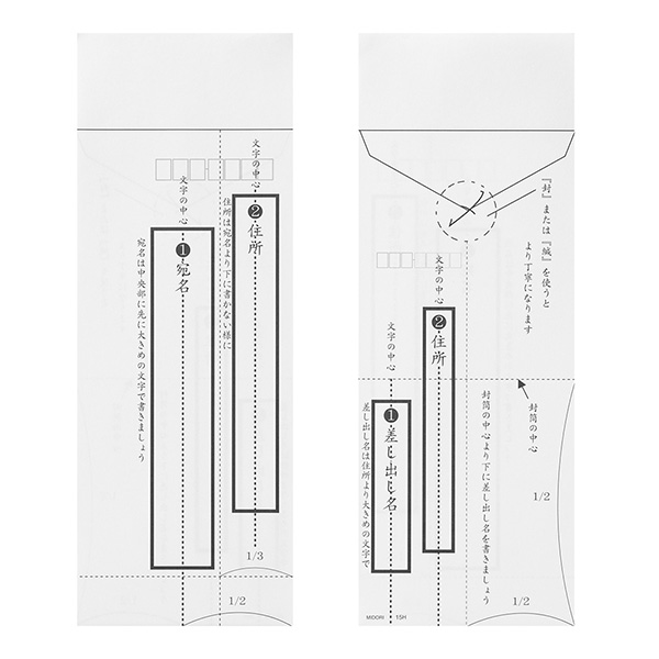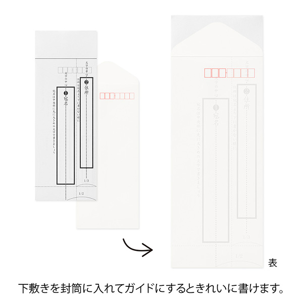 付属している「秘密の下敷き」を使って、だれでも簡単にきれいな住所、宛名を書くことができる封筒です。