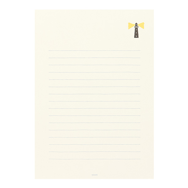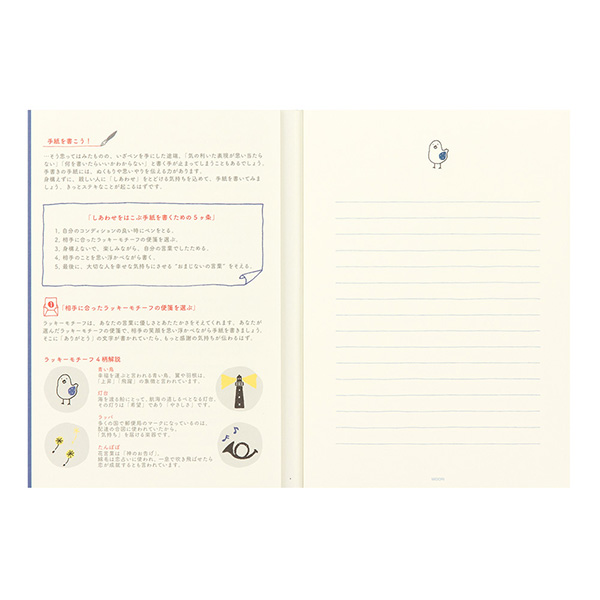 青い鳥、灯台、ラッパ、たんぽぽの4つのラッキーモチーフをあしらった、本のように開いて書ける便箋です。
