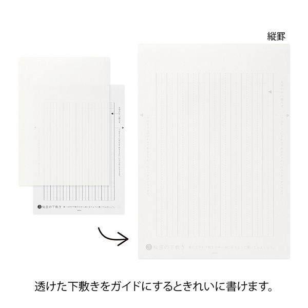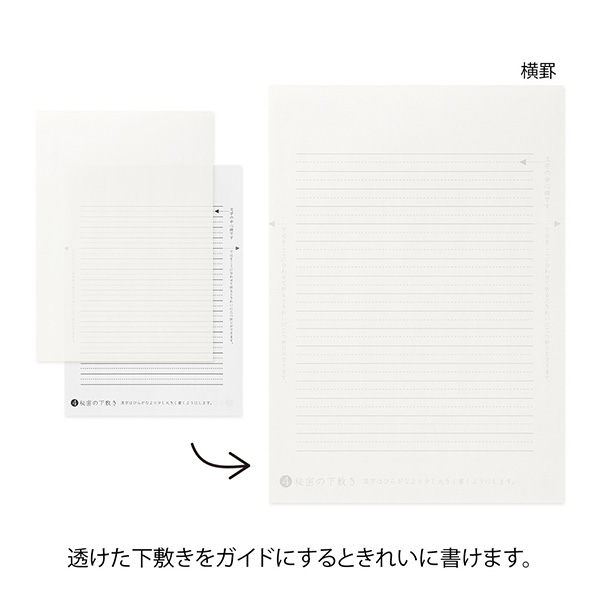 便箋は白とクリーム色の2色、「秘密の下敷き」は縦書き・横書きの両方が付いているので幅広くお使いいただけます。