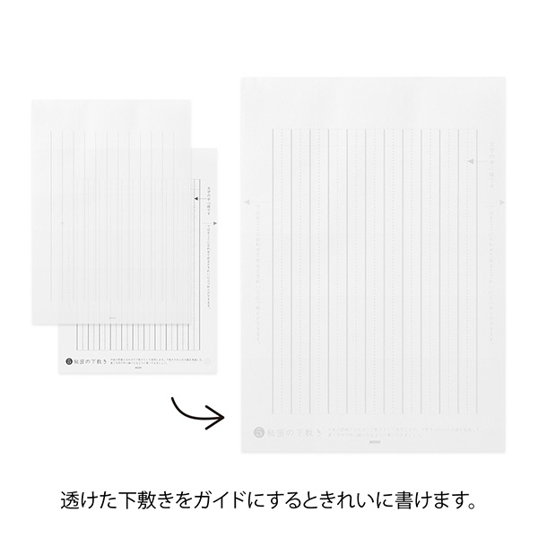 付属している「秘密の下敷き」を使って、だれでも簡単にきれいな手紙を書くことができる便箋B5サイズです。
