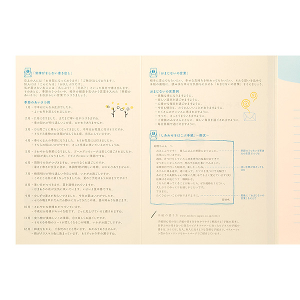左ページには、書き出しや挨拶の文例など、手紙を書く時の参考になるテキストが付いています。