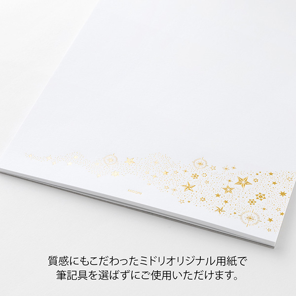 便箋の下部には、キラキラと輝く星空をイメージした「星柄」が表現されています。鉛筆で描いたような、繊細な線画の箔押しが特徴的なデザインです。